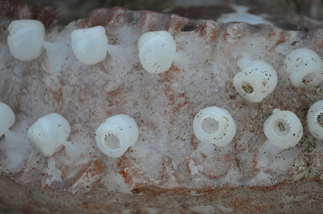 腕は非常に太く人の手首ほどもあり、吸盤も非常に大きいです。