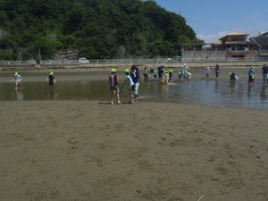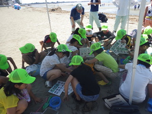 痛いほどの日差しが降り注ぐ炎天下をものともせず、ヤドカリや貝類だけでなく、うち上がったクラゲ、ゴカイや貝の卵のうなど色々なものに興味をもって「なんかいた!これ何??」という声があちこちから上がっていました。