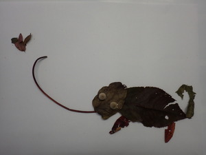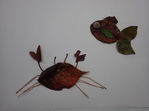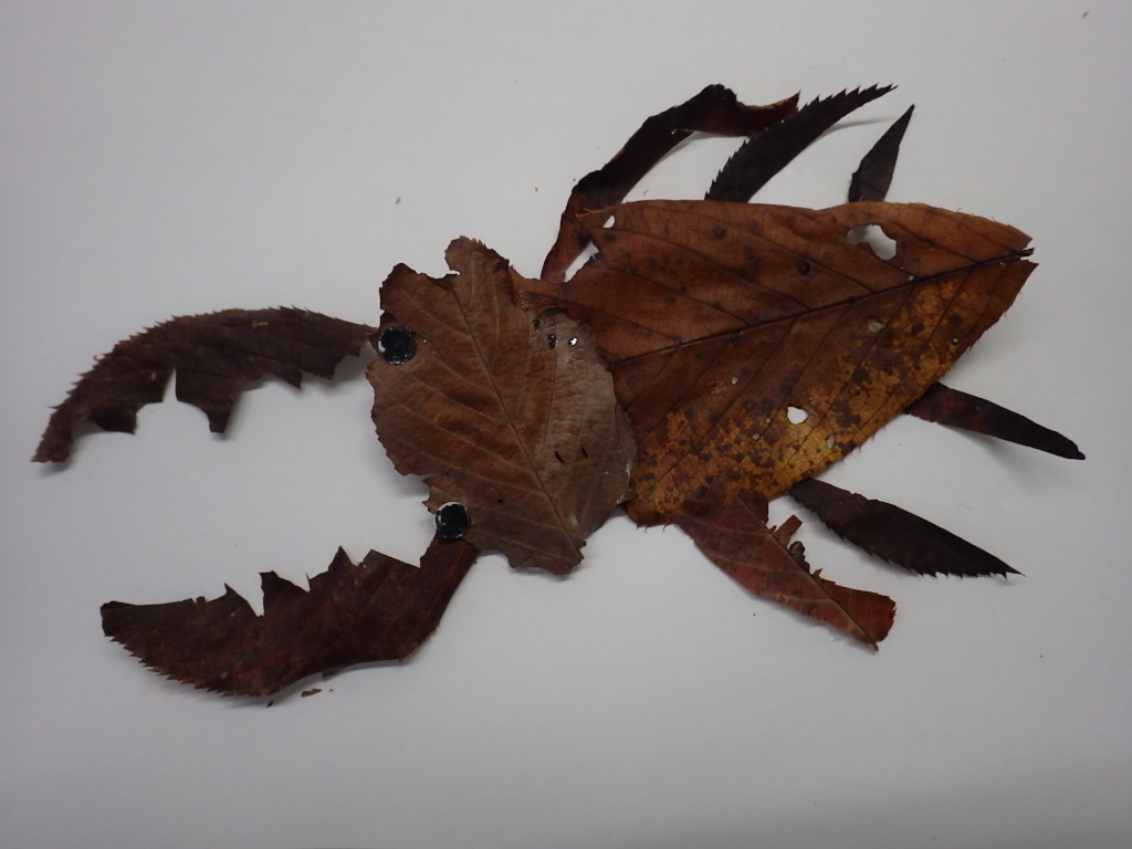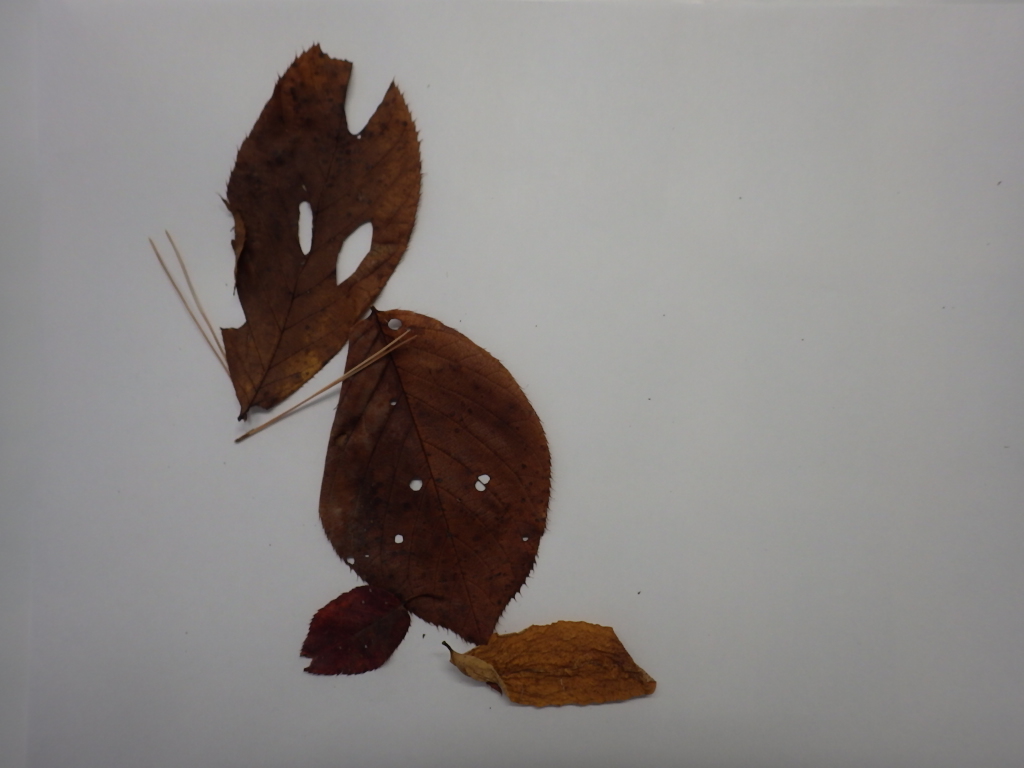 そしてもう一つ、落ち葉をあつめてお絵かきをしてもらおう!というワークショップです。私達の力が試されたのは、こちらたっだように思います。それは...見本を作らなくてはいけないから!!