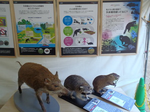 まず、ブースに来た来場者が近寄るのが、兵庫県立人と自然の博物館からお借りした剥製。実物の威力はすごいと実感しました。皆さん記念撮影をされます。剥製で紹介したニホンイノシシ・アライグマ・ヌートリアですが六甲の山中やふもとで見られるようになり問題になっている動物です。特にイノシシは登山客や街中でもスーパーの袋をもった人を襲うといった事故が多発しており、全国的にも珍しく市の条例で餌付け行為が禁止されていたりします。今回は外来生物の脅威とともに、野生生物とどのように付き合っていくべきか、啓発活動を行いました。