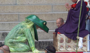蔵王堂に到着したら、蓮華会が行われ、その後蛙跳び行事が始まります。下の写真は、僧の方たちの読経を受けるカエル。