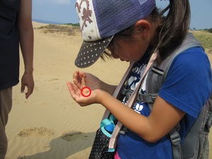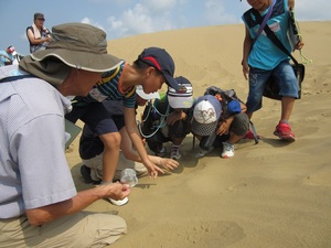 アリジゴクを捕まえたり、カワラハンミョウを追いかけたりと、珍しい砂丘のいきものにみんな大興奮!