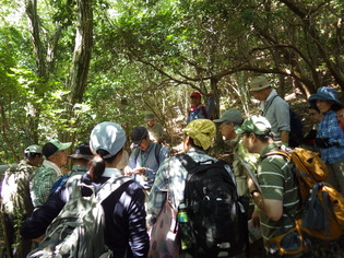 道すがら、色々な昆虫が見つかるたびに人の輪ができ、その昆虫の生態や見分けかたの解説をして頂きました。昆虫というと、「子どもの頃は平気だったけれど、大人になると苦手になった」という声をよく聞きます。私もあまり関心をもっているとはいえない時期がありましたが、山や川へ出かけるようになってからは、植物とともに自然と目に入ってくる存在になりました。そして、いつも行く場所に名前の知らない生き物がこんなにもいるなんて!!と興味がわくようになりました。