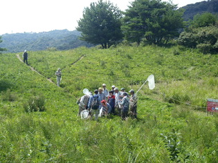 今回の観察エリアは、以前のススキ草原の景観を取り戻そうと、市民団体や研究機関等が協力してネザサの刈取りや植生調査を行っている場所でもあります。ネザサが優占していた場所も選択的に刈取りを行うことによって、ススキをはじめ他の様々な草原性植物が見られるようになり、またこの変化によって、カマキリやバッタ類といった昆虫をよく見かけるようになったと教えて頂きました。