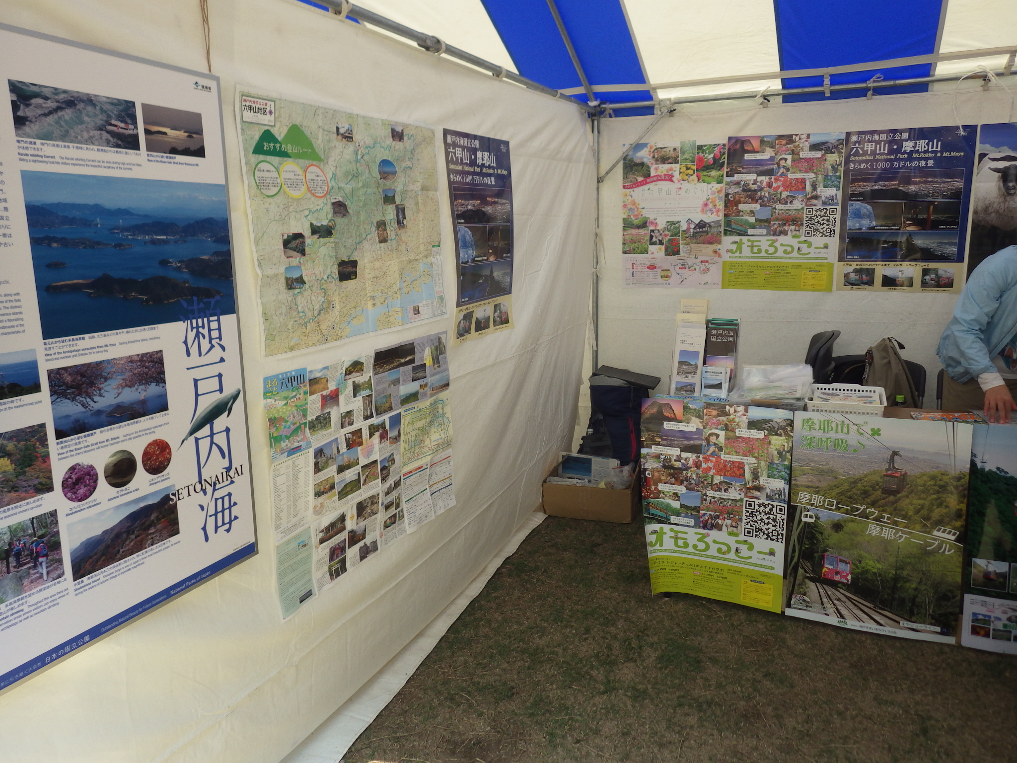 私たちは瀬戸内海国立公園六甲地域をPRすべく、「六甲山をまるごとたのしもう!」をテーマに六甲摩耶観光推進協議会のスタッフとパネル展示や六甲山に関するクイズなどを行いました。さらに、子どもたちとは六甲山に興味を持ってもらうために、六甲山の森林整備で伐採された間伐材を使ったコースターづくりを行いました。