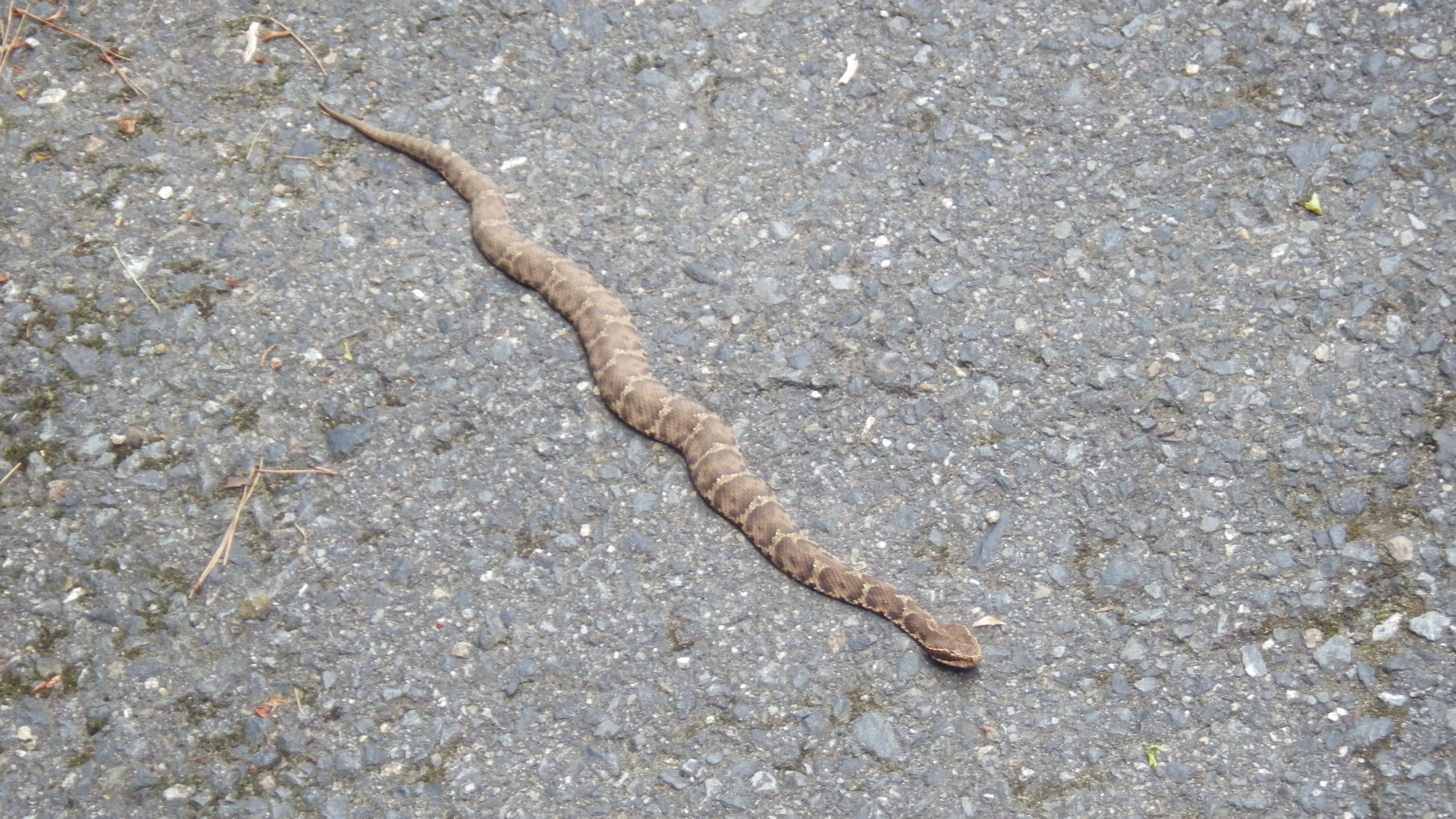 逆三角形の頭に平べったい体、毒蛇として有名なマムシ(二ホンマムシ)です。左が全体の写真、右が頭部のアップです。道の真ん中でひなたぼっこをし、完全に伸びきってリラックスしているようでした。この体勢であれば、急に動くことができないのですが、思いのほか動きが速いので注意が必要です。今回はマムシを刺激しないように、離れて写真を撮らせてもらいました。これからの季節は、マムシも活動が活発になりますので、山野に赴く際はどうぞご注意ください。見つけても近寄らず、刺激せず、そっと離れるのがいいですね。