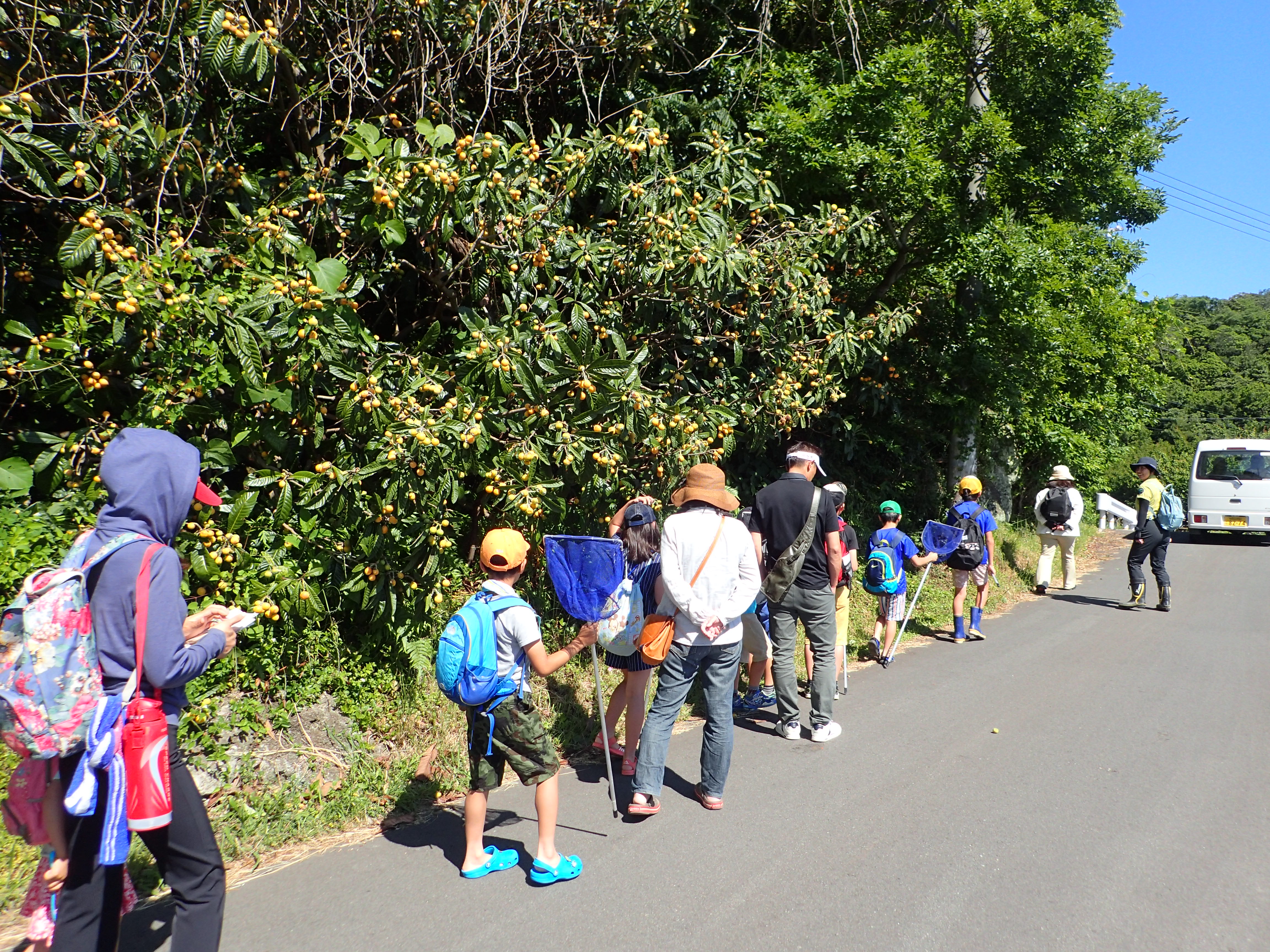 ため池までの道中には、枇杷にたくさん実がなっていて、参加者も「美味しそうだね。」と眺めていました。また、海岸では、打ち上げられたウミガメの骨を発見した子どもたちが大興奮でした。