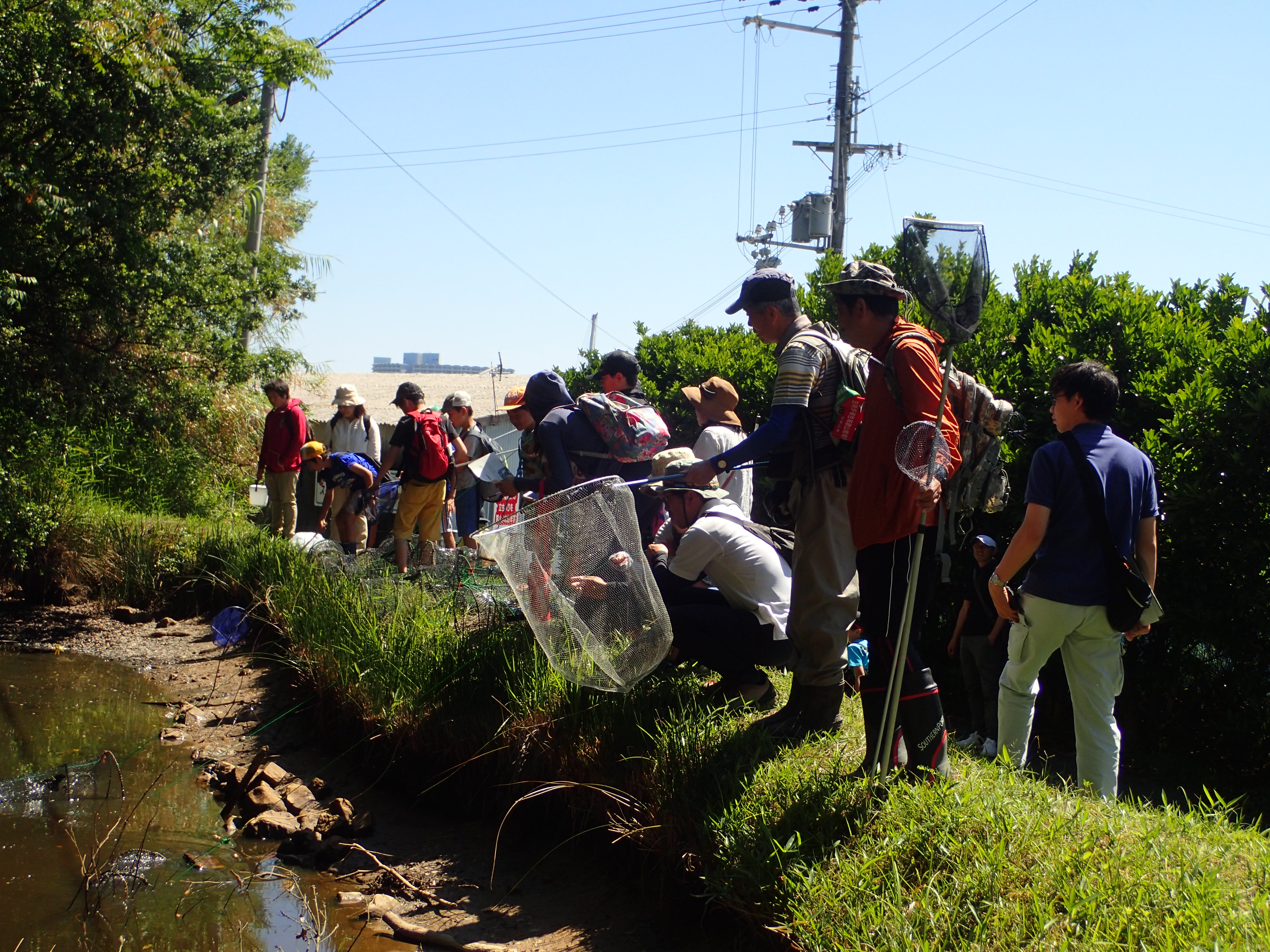 今回は、ため池にどのような生物が暮らしているかを調査するため、講師をお招きして約15名の親子に調査に参加していただきました。