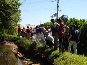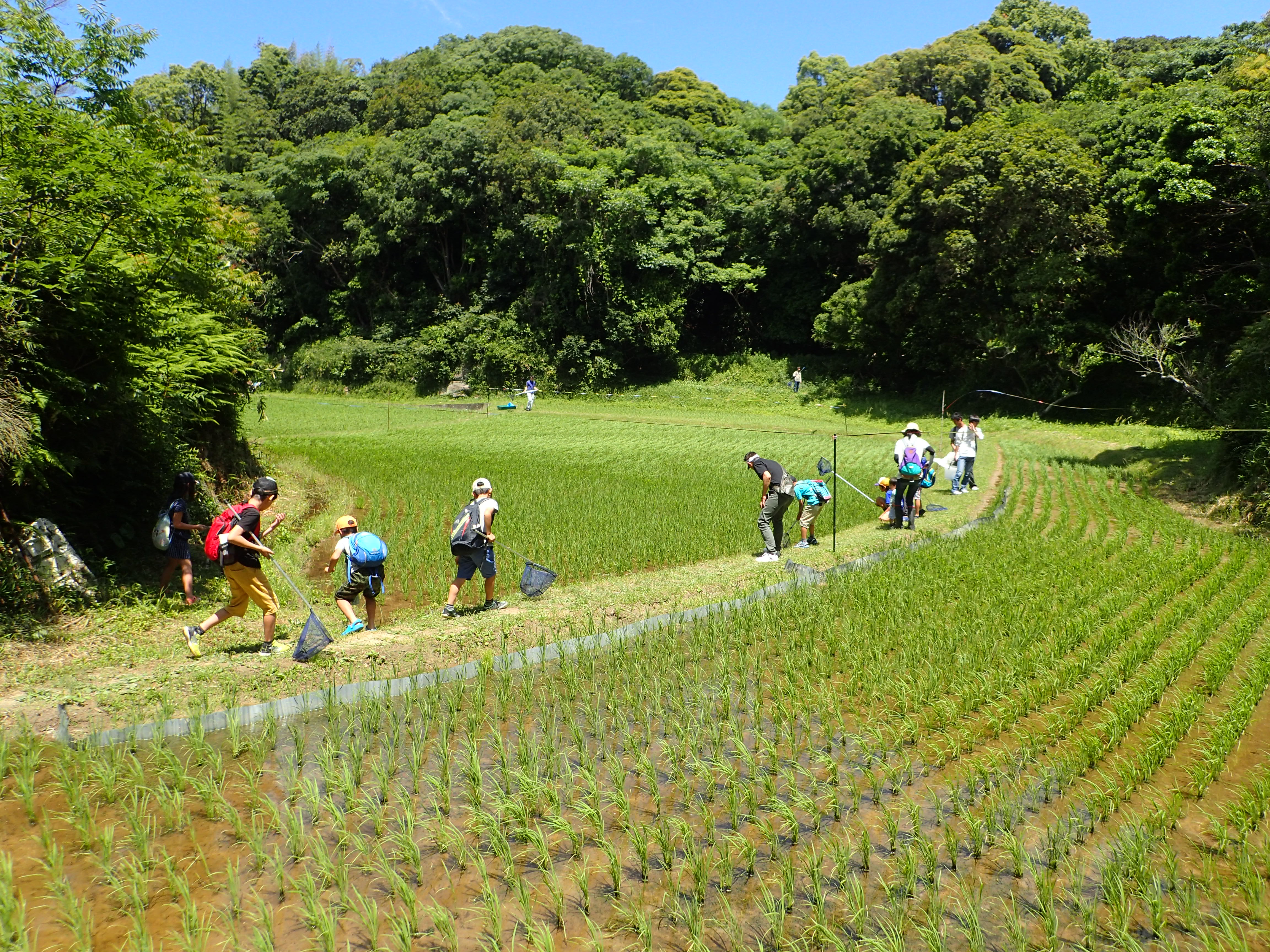 | 捕まえたいきものを講師に見せる参加者 田んぼの観察 |