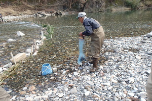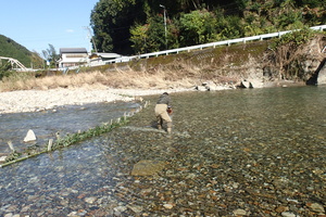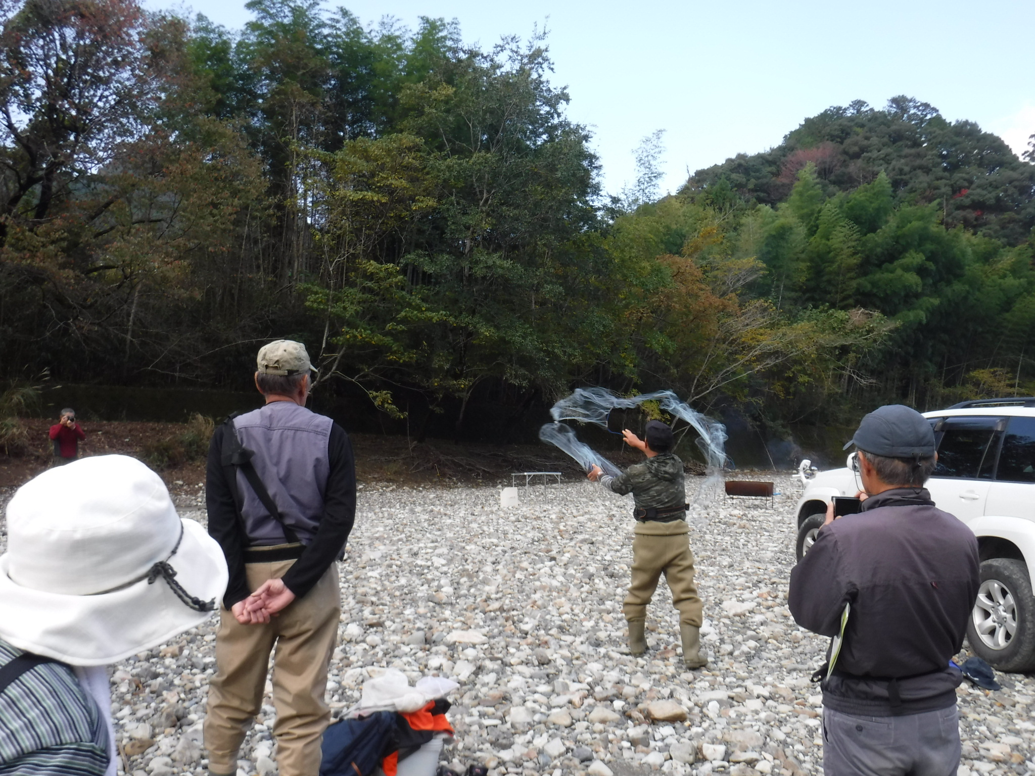 当日は、講師の先生から、アユの習性として、9月から12月に産卵のために上流から下流へと移動することやこの習性を利用した小鷹網漁について、網の種類や投げ方などの説明も受け、'せぎ'の上流に網を投げて、下流を目指して集まったアユを捕る様子を見学しました。講師に網の投げ方を教わり、実際に網投げを体験した子もいました。また、熊野川で見られる回遊魚(アユ、ウナギ、ハゼ科の魚等)、純淡水魚(コイ、オイカワ、カワムツ、アマゴ等)、河口近くの汽水域にも住む海水魚(ボラ、スズキ等)の解説もあり、きれいな川だからこそいろいろな魚が生息できることも知ってもらいました。