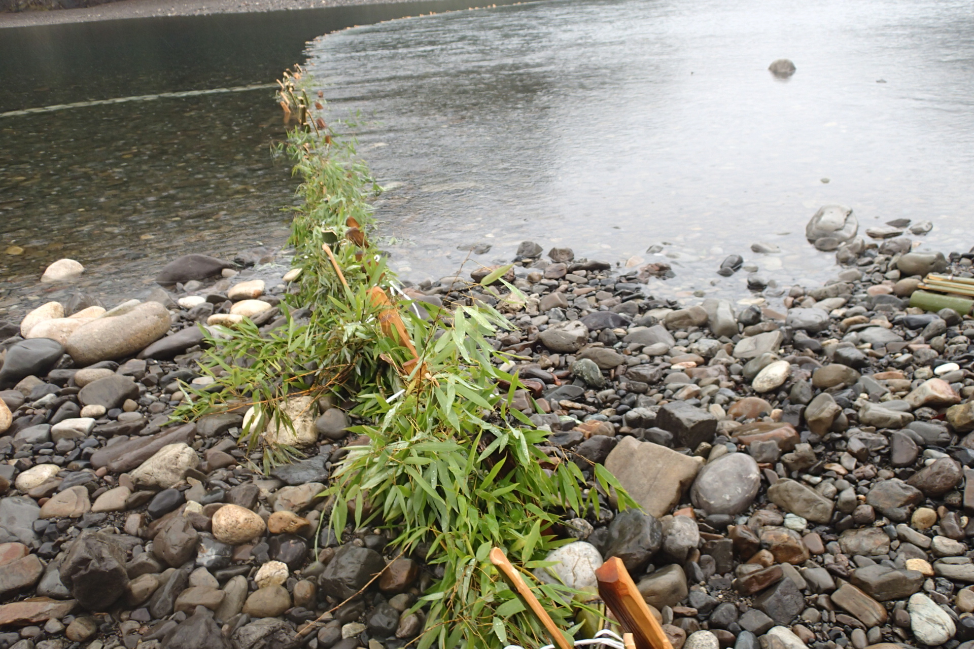 10月末に襲来した台風21号と22号の大雨の影響で、開催場所に作っておいた'せぎ'(竹や笹を使い、魚を集めて捕る仕掛け 写真1、2参照)」が流されてしまい、川の濁りもとれず開催が危ぶまれましたが、急遽、開催場所を変更し、講師の方に'せぎ'を作っていただいて、無事に当日を迎えることができました。