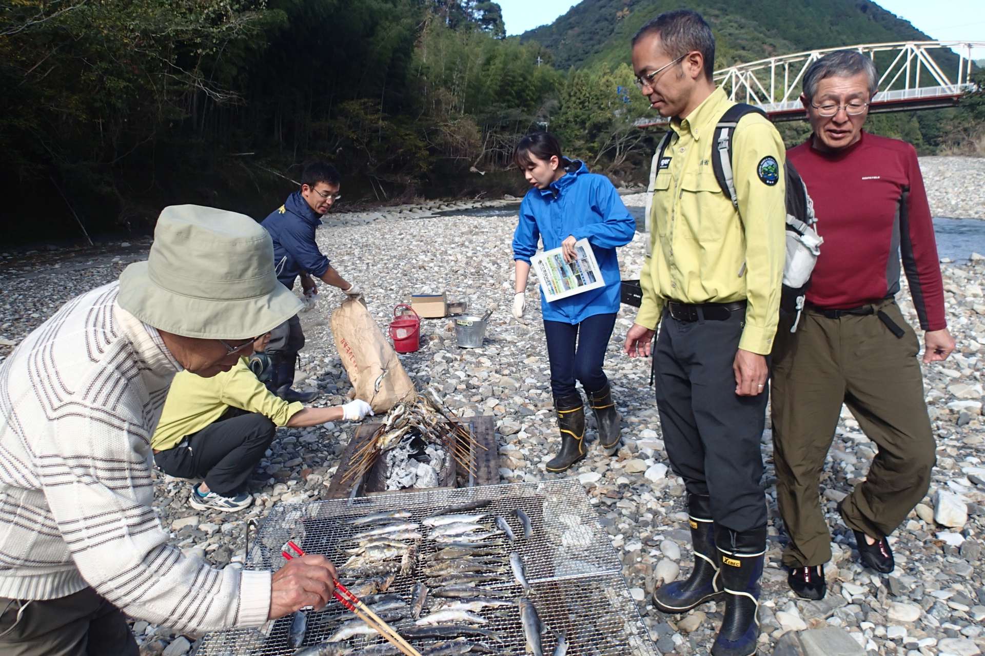 獲ったアユは、その場で焼いて試食し、新鮮なアユに舌鼓を打ちました。