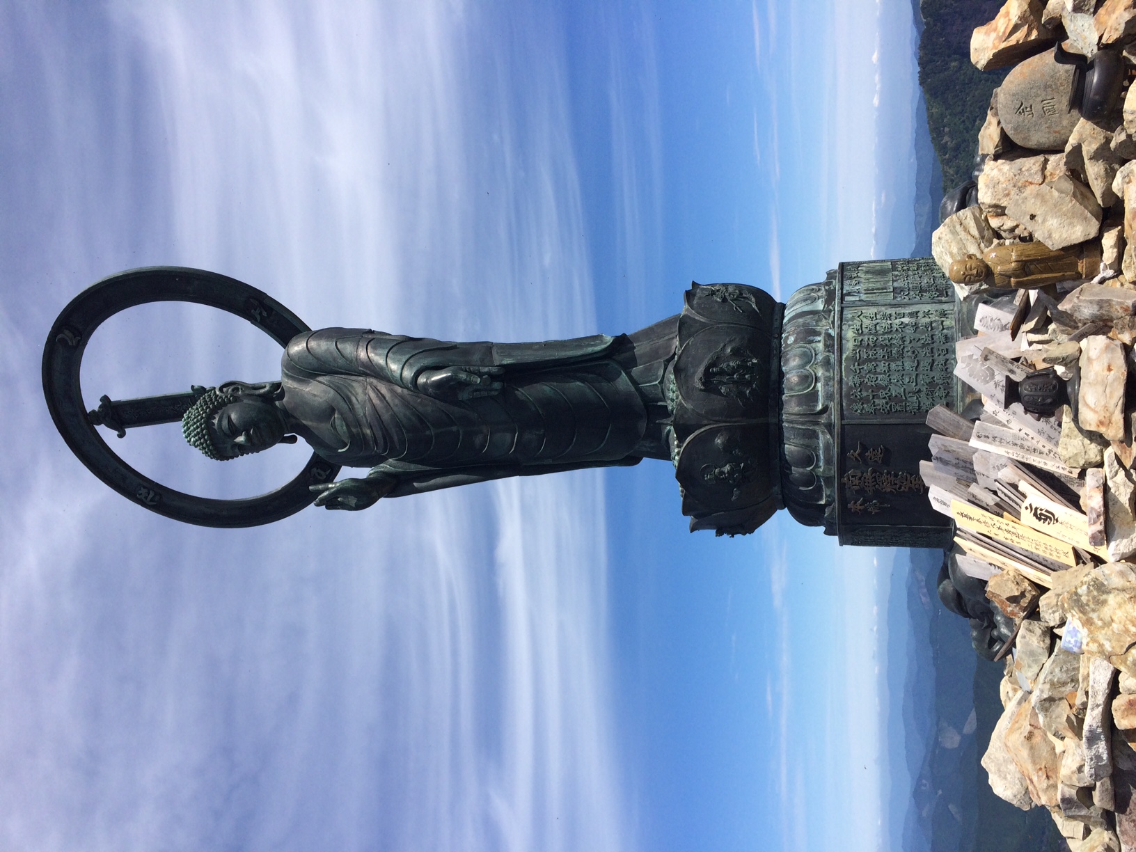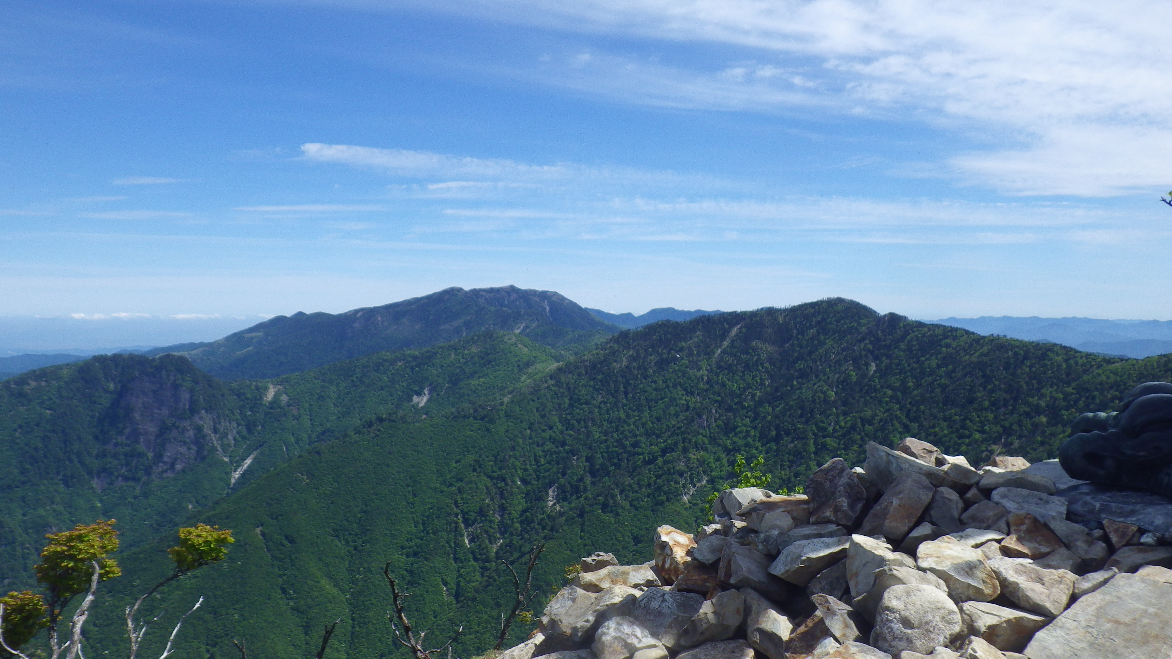 右の写真は、八経ヶ岳方面を見たもので、大峰奥駆道が稜線を走ります。左の写真は、山頂に御座します釈迦如来像です。釈迦ヶ岳山頂に建立されたのは大正13年で、その後平成19年に修復されたそうです。岡田雅行という剛力が、一人で担ぎあげたといわれています。すごいですね。ちなみに、剛力とは職業のことで、大ざっぱに説明すると道案内もする歩荷さんです。
