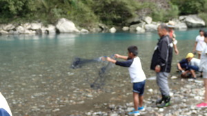 午前中は講師の方が子供の頃にしていた漁法や、使っていた漁具などの紹介をしてくださり、皆さん興味深く聞いていました。事前に捕獲されたアユやアユカケ、ウグイ、カジカなどの魚類を目の前にして、ついつい捕まえたくなっちゃう子供達。この後ビンヅケ漁や小鷹網漁などの漁法も体験しました。