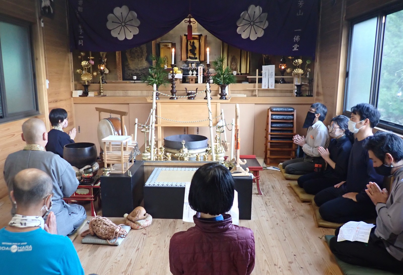 昼からのプログラムとして、修験者の方が日々行われている止観(座禅)瞑想を体験しました。初めての止観瞑想でしたが、修験者の修行を肌で感じることができました。また、修験者の方はホラ貝を持っており、邪気を払う魔除けの役割や修験者達の意思疎通としても使用されているそうです。