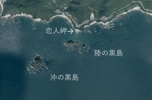 すさみ町には「恋人岬」と名の付く場所があります。この岬のすぐ沖には二つの島があり、岬のすぐそばにあるのが「陸の黒島」、少し沖側にあるのが「沖の黒島」と名付けられています。