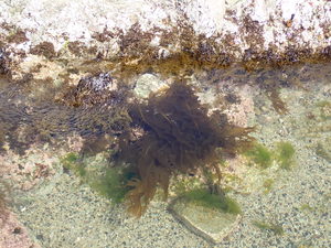 (大浦湾の浅瀬の岩に生えているワカメ)