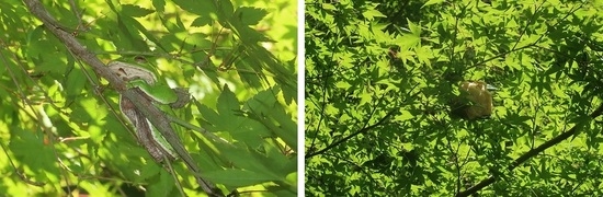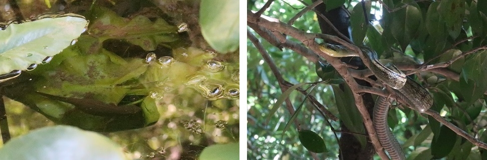 カエルの他にも、池の中では落ちてくる卵を狙おうとアカハライモリが待ち構えていました。また木に登ってくるカエルを捕まえるためか、ヘビの姿も・・・