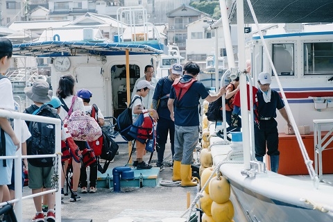 今年のイベントは家島の漁業体験・調理体験・自然観察が体験できる1泊2日のイベント。開会式で注意事項の説明を受けたら、イベントスタート。さっそく船に乗り込んで漁業体験のスタートです。