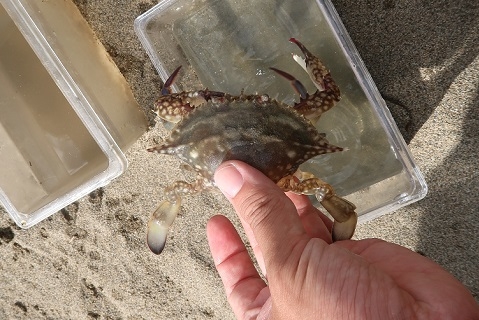 | 大きなガザミを捕まえた子どもがいたので、見せてもらいました。ひし形の甲羅が特徴のガザミ、よく見ると一番下の足は平べったくなっているのが分かります。このヒレのような足(遊泳脚といいます)を使って、とても早く泳ぐことができるだけでなく、砂の中に潜って隠れることができます。 |