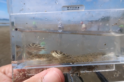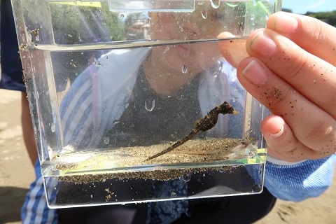 | タツノオトシゴを見つけてくれた子どもがいたので、見せてもらいました。新舞子浜の周辺にはアマモ場がありますので、貴重な繁殖地になっているのかもしれません。 |