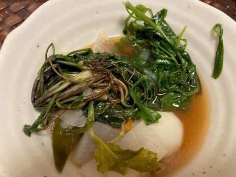 セリ…茎や葉より、根の方が芳醇でした。全体で香りが良く、美味しかったです。(セリは個人的に香りが好みで、仙台に行った際には、セリ鍋としていただいたこともある懐かしい味でした。)