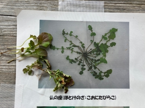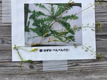 最後にナズナ。ナズナは、今回、見つけるのに苦戦しました。参加者40名で探して、見つかったのは2株だけでした。ナズナは通称でペンペン草と呼ばれるもので、数が少ないわけではないのですが、今回の観察場所において、この日は少なかったようです。ナズナだけは全員が摘むことはできませんでしたが、でも、これで野外での目的の5種すべてが見つかりました。