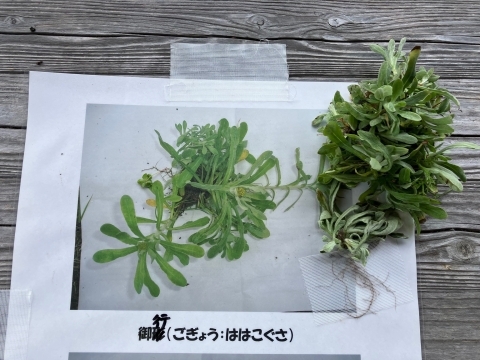 その次に見つけたのは、ハハコグサのことであるごぎょう。地面に張り付くように横に葉を広げていて、土と共に摘むような状況でした。近くにはハハコグサに似ているけれど、葉が波打っているような別の植物もあり、違いの説明を聞きながら、探しました。