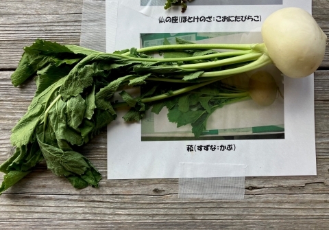 最後の2つのすずな、すずしろとは、カブとダイコンのことを指すそうなので、畑で採れるものになります。