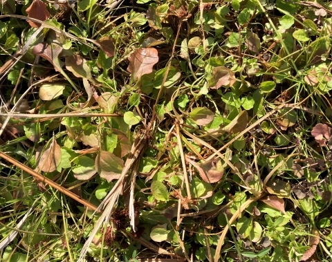 仏の座は、現在のコオニタビラコのことを指すそうです。田んぼの畦や、稲が刈られたあとの田んぼの中でも畦近くで見つかりました。少し赤茶色が入っている葉が特徴的でした。