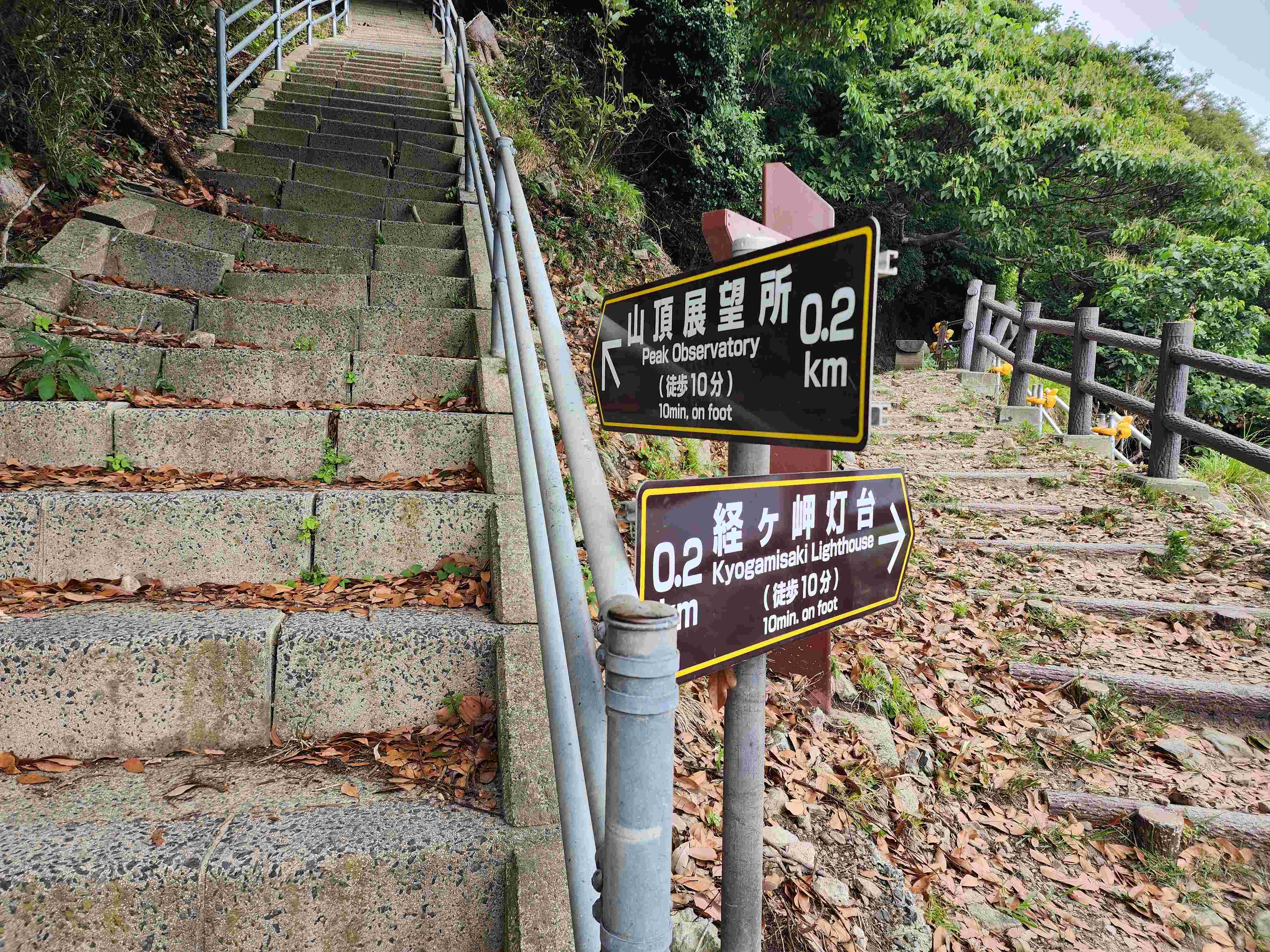 最後のモニタリングは、山陰海岸ジオパークの東端の経ヶ岬です。ここでは駐車場の案内看板等を点検し見どころである経ヶ岬灯台まで登りました。途中まではツズラ折れの急坂で疲れもあり大変でしたが、途中からなだらかな道になり一安心しました。