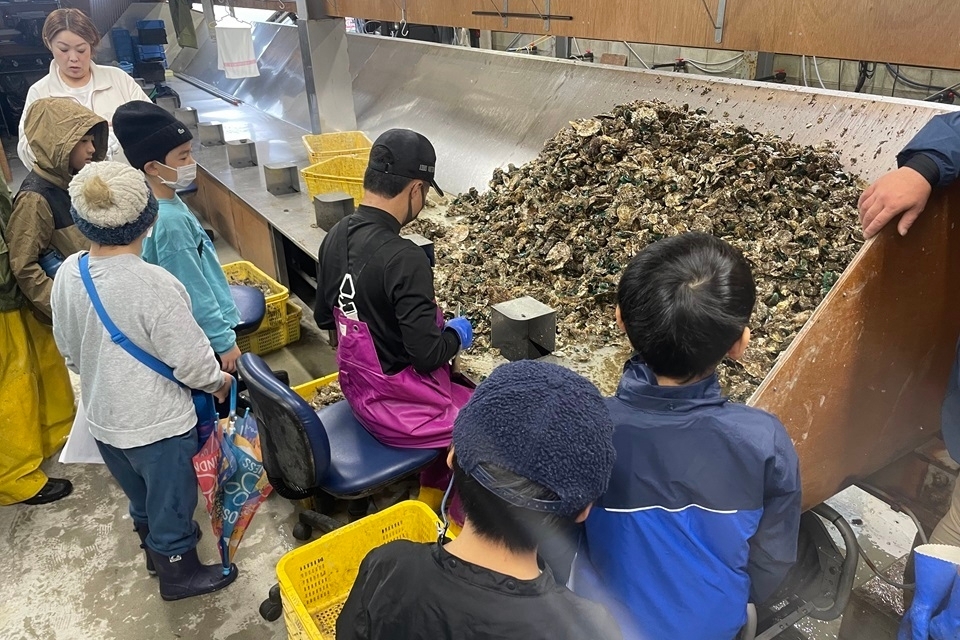 見学の後、水揚げした牡蠣を少し分けてもらい、子ども達にも牡蠣をむく体験をしてもらいました。牡蠣殻はなかなか硬く、うまくむくのは難しかったようですが、みんな頑張って取り組んでいた姿が印象的でした。また、牡蠣殻には牡蠣だけでなく、カニやゴカイ等の様々な海の生き物の住処になっている様子も確認できました。