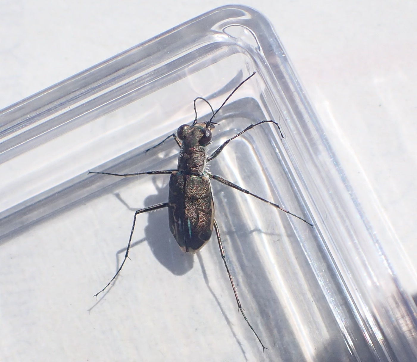 ハンミョウは2cmほどの大きさであるのに対し、今回の観察対象の「ヨドシロヘリハンミョウ」は1cmほどの小型で、体色も落ち着いた灰茶色をしています。甲の部分に白い縁取りがあるため、名前に「シロヘリ」がついているものです。「ヨド」は、大阪府にある「淀川」の河口で採取された個体に基づいて記載された種であることに由来しています。