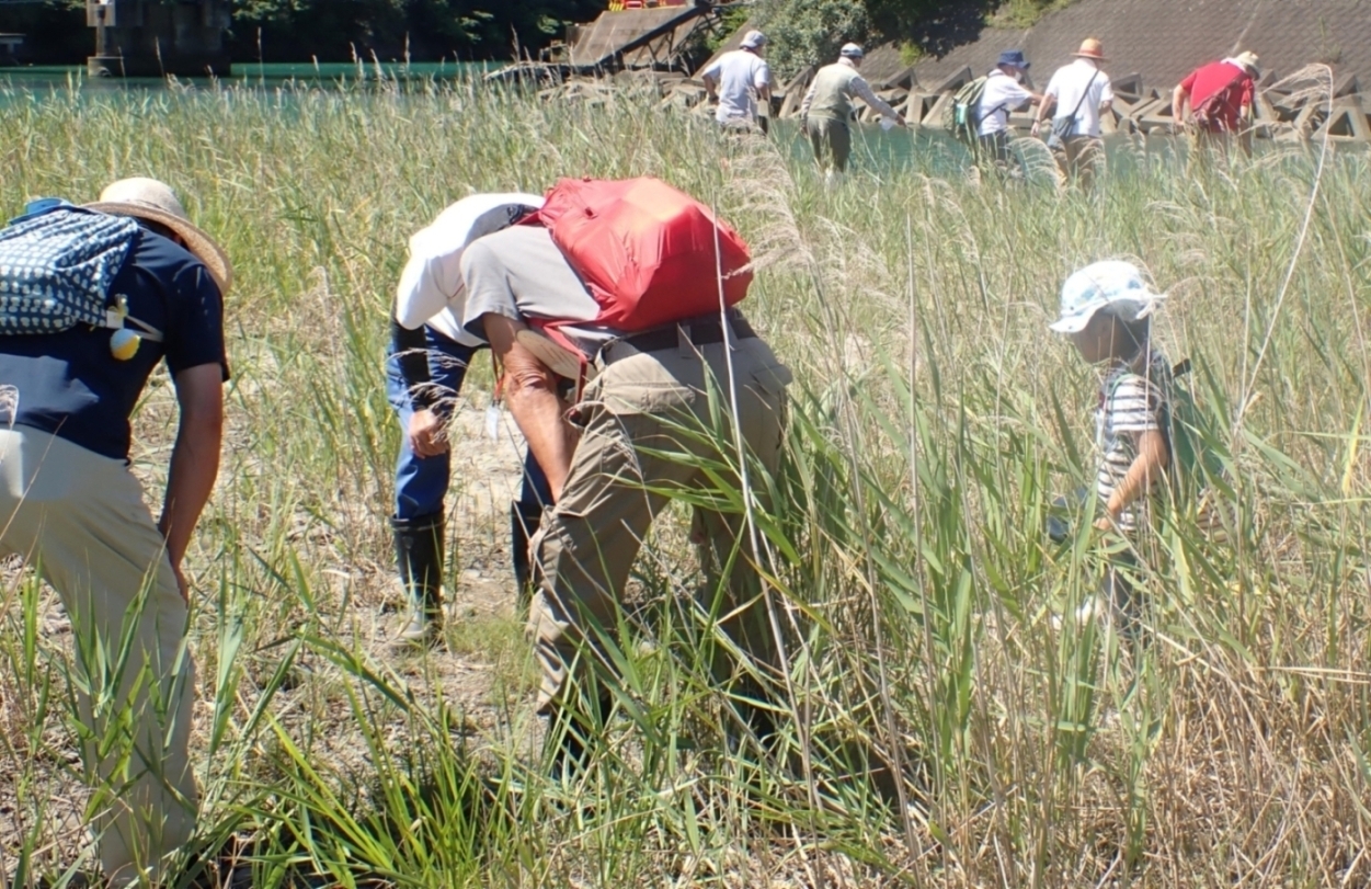私は、はじめの2地点では、先に誰かが見つけたものを教えていただき観察することしか出来ていなかったため、最終地点では自力で見つけたい!と意気込んでいました。前の2地点でヨシ原際の開けたところで見かけることが多かったため、同じような場所で集中して探していると…、!!