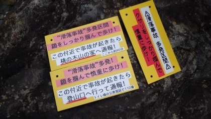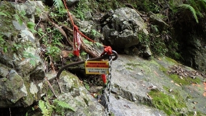 上の写真は、今年度滑落事故が発生した場所です。写真のとおり山側の鎖をつかみながら歩く、人1人がやっと通れるくらいの細い道です。