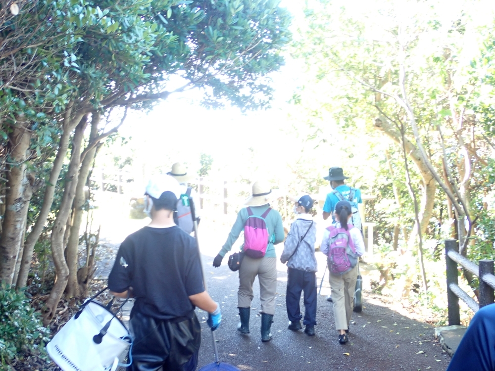 高台となっている日本童謡の園公園駐車場に集合し、安全対策の話などをしてからいざ出発!国の天然記念物になっている江須崎を望みながら階段を下りると海岸に出ます。