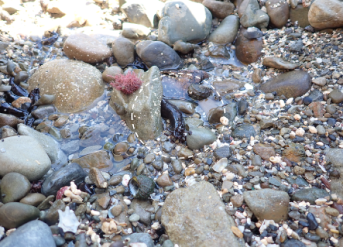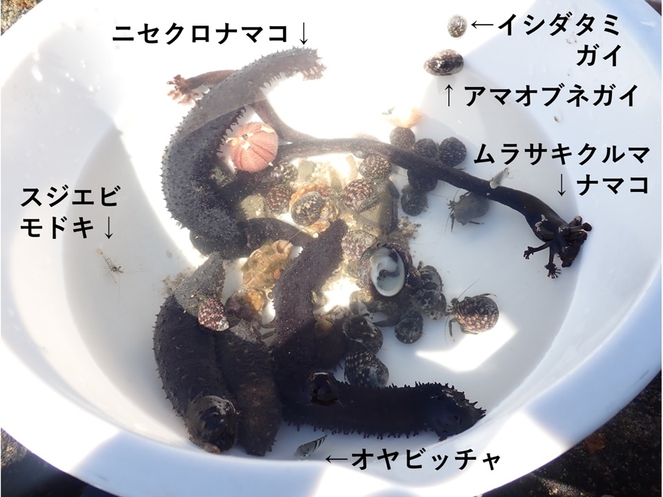 石をひっくり返すとその下には少し海水で湿っている場所で、この場所では、ムラサキクルマナマコやイシダタミガイなどが観察できました。