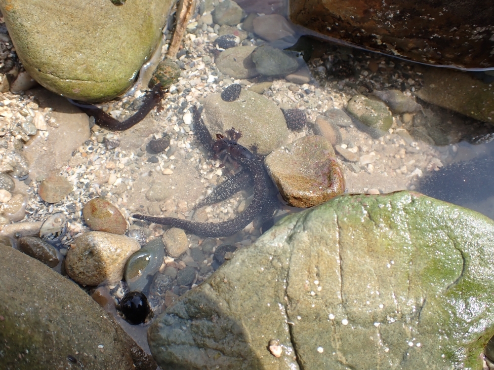 さらに海に近づいた海水の差す静かな水辺では、これまでも確認できた生物以外にエビやウニ、小さな魚が3種程度見つけることができました特に魚は動きがすばしっこく、写真さえうまく撮ることができません。小さなタイドプールでも捕まえるのは至難の業でしたが、一人の小学4年生の女の子は、オヤビッチを7尾も捕まえている様子に感服しました。