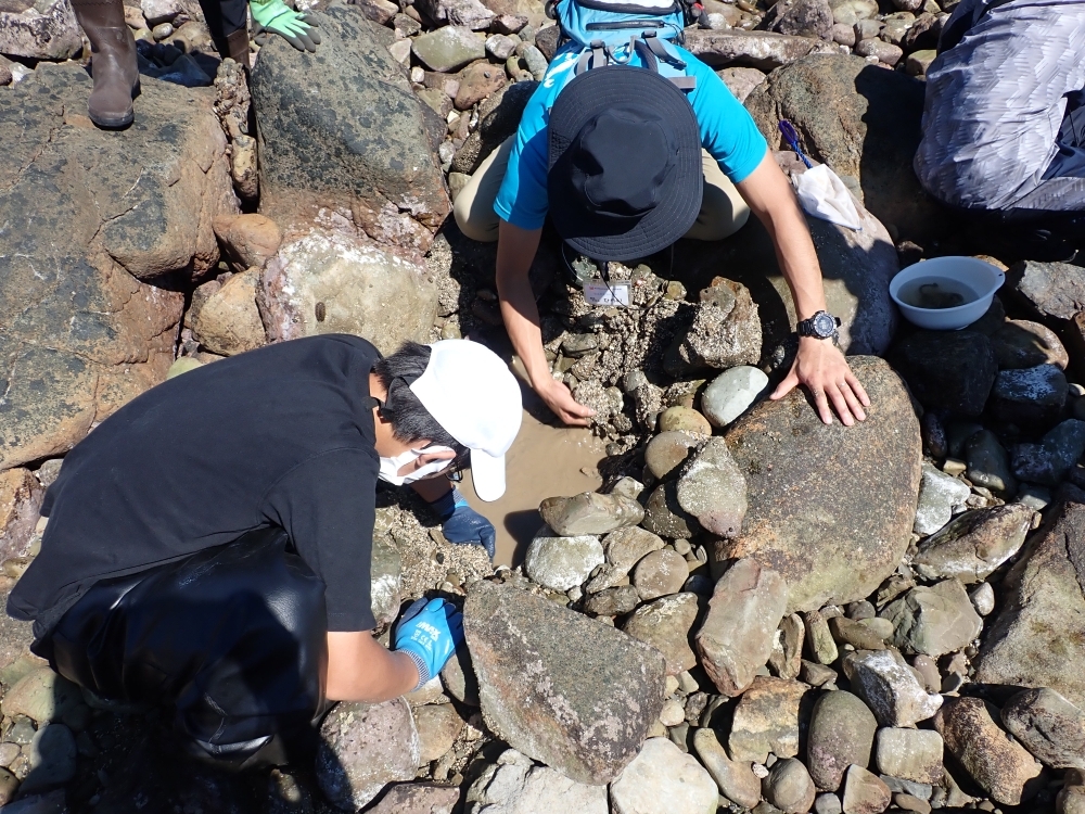平井館長のお話によると、この海岸では新種の生物が何件も見つかっていて、館長や、水族館主催の観察会参加者により見つけられたものが新種であったこともあるそうです。今回の参加者からも、自分も新種を発見したい!との声があがっていました。
