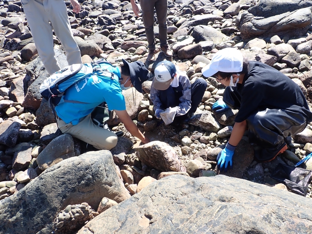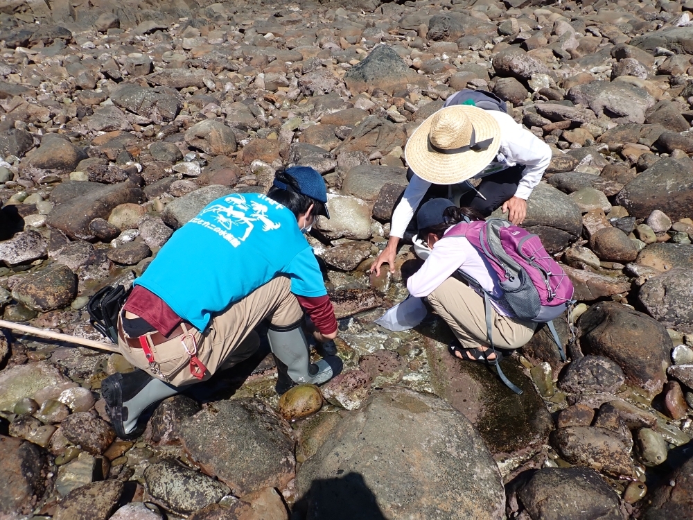 これは、潮間帯上部ほど生物にとって生存環境は厳しい(水からの露出時間や水温、波浪など安定しない環境である)ためであるということを講師からご説明いただきました。これにより、海に近づくほど生物種が多くなる理由がよく分かりました。