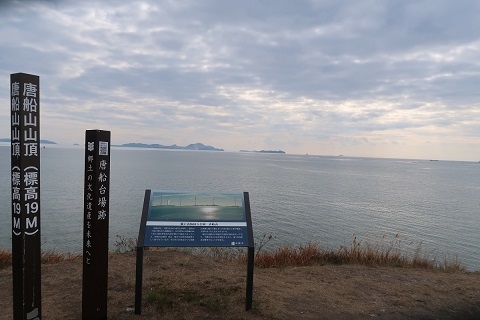 唐船山の名前の由来は、日本が唐の国と往来していたころの船が、沖で嵐に遭って沈没して流れ着いた場所に千種川からの土砂が堆積して次第に山となった、という言い伝えから来ています。言い伝えが本当であれば、19mという標高の低さも納得ですね。