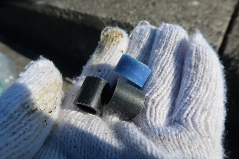 瀬戸内海でよく見る漂着ごみといえばわかりますでしょうか?厚さ2cm、プラスチック製のパイプで、正解はカキの養殖に使われる豆管(まめかん)という部品です。カキ養殖が盛んな瀬戸内海でよくみられる漁具の一種ですね。漂着ごみという観点から見ても、日本海・太平洋・瀬戸内海と地域によって色々な違いがあるのが分かって面白いですね。