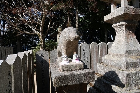 この先山の山頂にたたずむ千光寺には、大猪に化けた観音菩薩に導かれた狩人がこの地にお寺を開基したという縁起が伝わっています。その伝承にちなんで、本堂の前に設置されている石像は狛犬ではなく、イノシシの姿をしています。