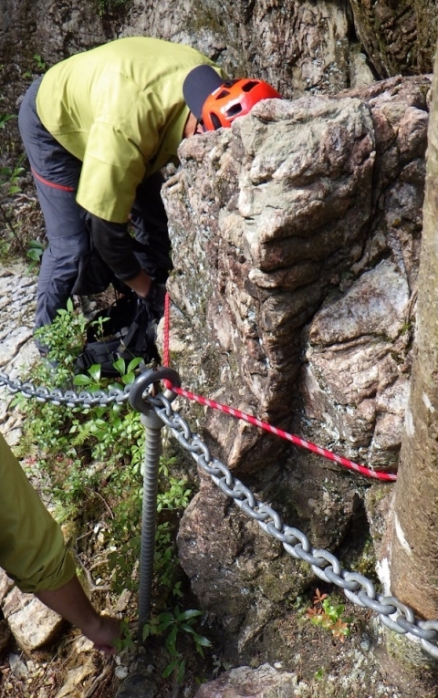(鎖の支柱がグラついていたので、岩にロープを張り固定しています↓)