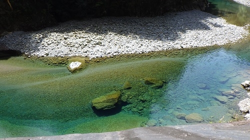 川の水は美しいエメラルドグリーン・・・