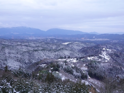 この日は、金峯山寺を中心とした門前町にある寺社や店舗の屋根に雪が積り、尾根上に浮かび上がった冬姿の吉野山が見られました。