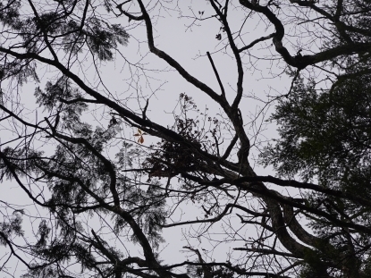 樹上での採食の際には枝先のドングリを食べるために枝を折り、食べ終わるとその枝をお尻の下に敷き鳥の巣のように折り込むようです。