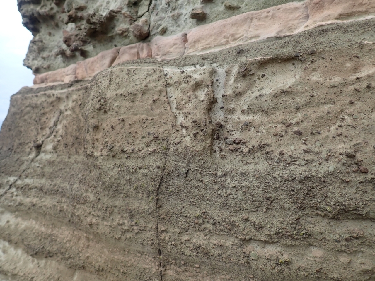 顔を上げると目の前にどーんと柱状節理(岩に規則正しく入った柱状の割れ目)が見えます。また、縦の節理の途中に横向きの地層が入り込んでいる不整合が見られました。