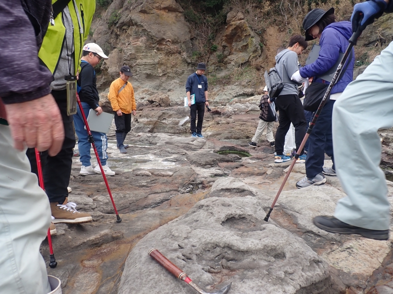 貝などが岩に開けた穴や、くぼみにはまった石が波によって回転し丸い穴が開いたポットホール(甌穴:おうけつ)や、木の化石、動物の足跡化石など見どころがたくさん。皆で化石を探しました。
