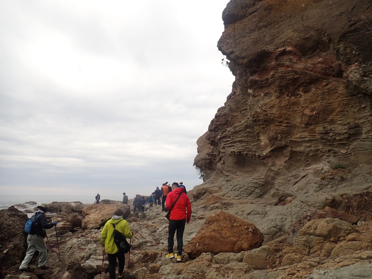 いろいろな話を聞きながら海岸の一番端まで来ました。岩場はポットホールや亀裂などでボコボコして歩きにくく、下を見ながら注意して歩きました。